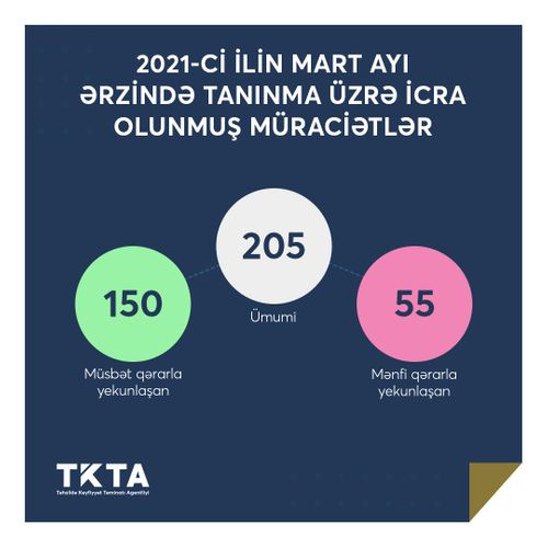 Agentlikdən verilən xəbərə görə, qeyd edilən ay üzrə 205 müraciətçinin 150-si barədə müsbət qərar verilərək müvafiq şəhadətnamələr təqdim edilib, 55 nəfərin müraciəti isə mənfi qərarla yekunlaşıb.
