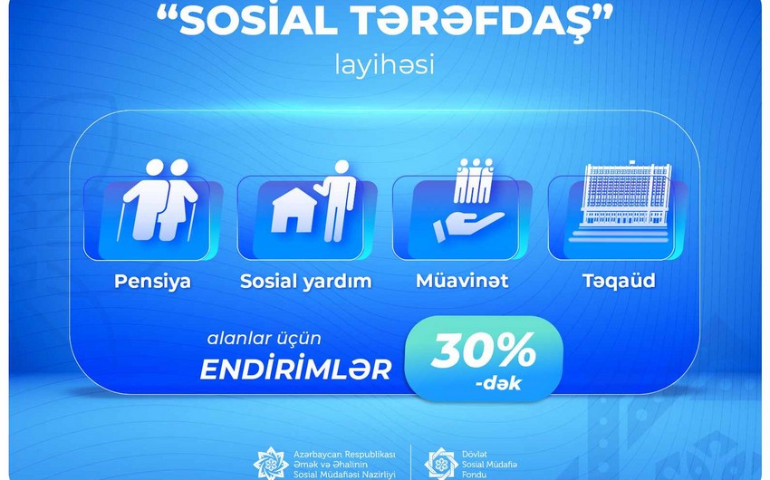 Ölkəmizdə fəaliyyət göstərən 230-dan çox şirkət Əmək və Əhalinin Sosial Müdafiəsi Nazirliyi yanında Dövlət Sosial Müdafiə Fondundan sosial ödəniş alan şəxslərə “Sosial tərəfdaş” layihəsi çərçivəsində 30 %-ə qədər endirim təklif edir. Bu kateqoriyadan olan şəxslər bu günədək tərəfdaş şirkətlərin təqdim etdiyi endirimlərdən faydalanaraq, nağdsız şəkildə 520 mindən çox alış-veriş həyata keçiriblər.