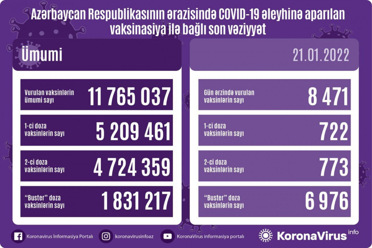 Ölkədə vurulan vaksinlərin ümumi sayı 11 765 037, birinci mərhələ üzrə vaksinasiya olunanların ümumi sayı 5 209 461, ikinci mərhələ üzrə vaksinasiya olunanların sayı 4 724 359, buster doza üzrə vaksinasiya olunanların sayı isə 1 831 217 təşkil edir.