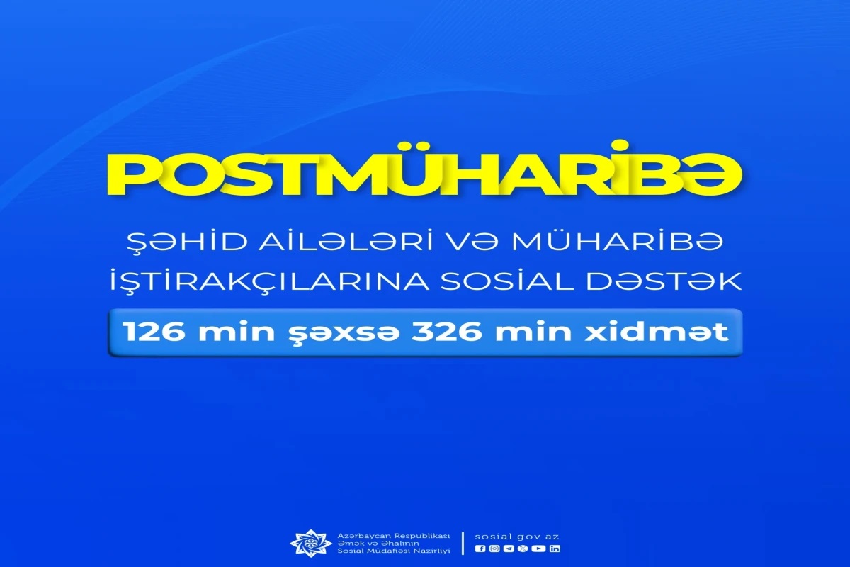 Postmüharibə dövründə şəhid ailələri üzvləri və müharibə iştirakçıları olan 126 min şəxsə 326 min xidmət göstərilib.