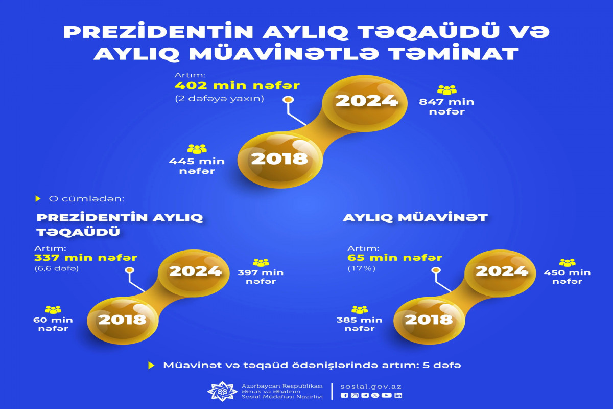 Qeyd olunan dövrdə Əmək və Əhalinin Sosial Müdafiəsi Nazirliyi tərəfindən Prezidentin aylıq təqaüdü və aylıq müavinətlə təmin olunanların sayı 402 min nəfər və ya iki dəfəyə yaxın artaraq 847 min nəfərə, o cümlədən:
