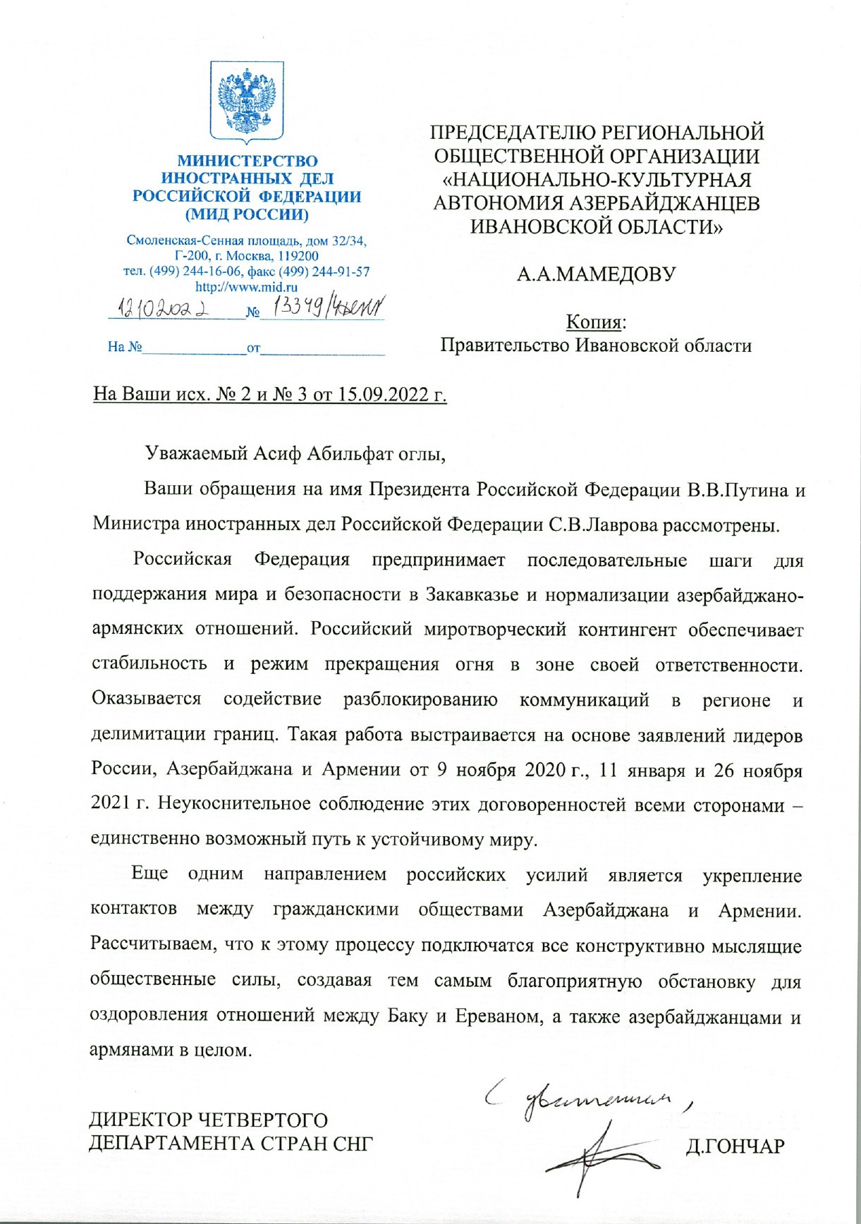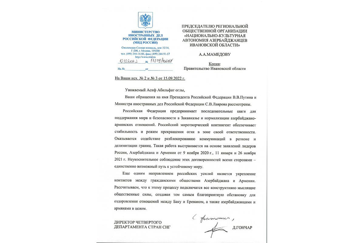 Diasporla İş üzrə Dövlət Komitəsindən verilən xəbərə görə, Rusiya XİN-in MDB ölkələri üzrə dördüncü departamentinin direktoru Denis Qonçarın adından “Samara vilayəti Azərbaycanlılarının Liqası” ictimai təşkilatının icraçı direktoru Müşfiq Dəmirova və “İvanovo Azərbaycanlılarının Milli-Mədəni Muxtariyyəti” regional ictimai təşkilatının sədri Asif Məmmədova ünvanlanan cavab məktublarında bildirilib ki, soydaşlarımızın Rusiya Prezidenti Vladimir Putinin və xarici işlər naziri Sergey Lavrovun adına göndərdikləri müraciətlərə baxılıb.