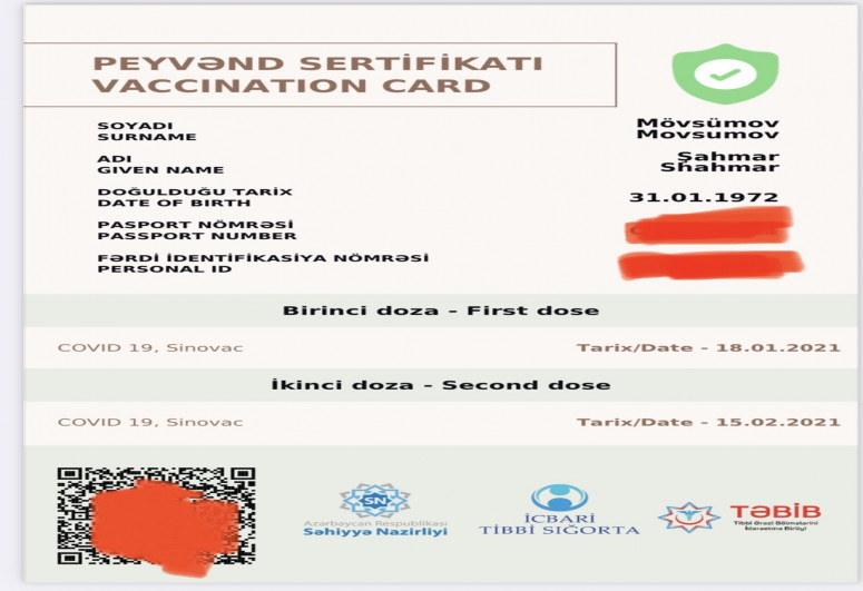 "Twitter” hesabında COVİD pasportunun fotosunu paylaşan Ş. Mövsümov qeyd edib ki, pandemiyaya qalib gəlməyin və normal həyata mümkün qədər tez qayıtmağın yeganə yolu peyvənddir.