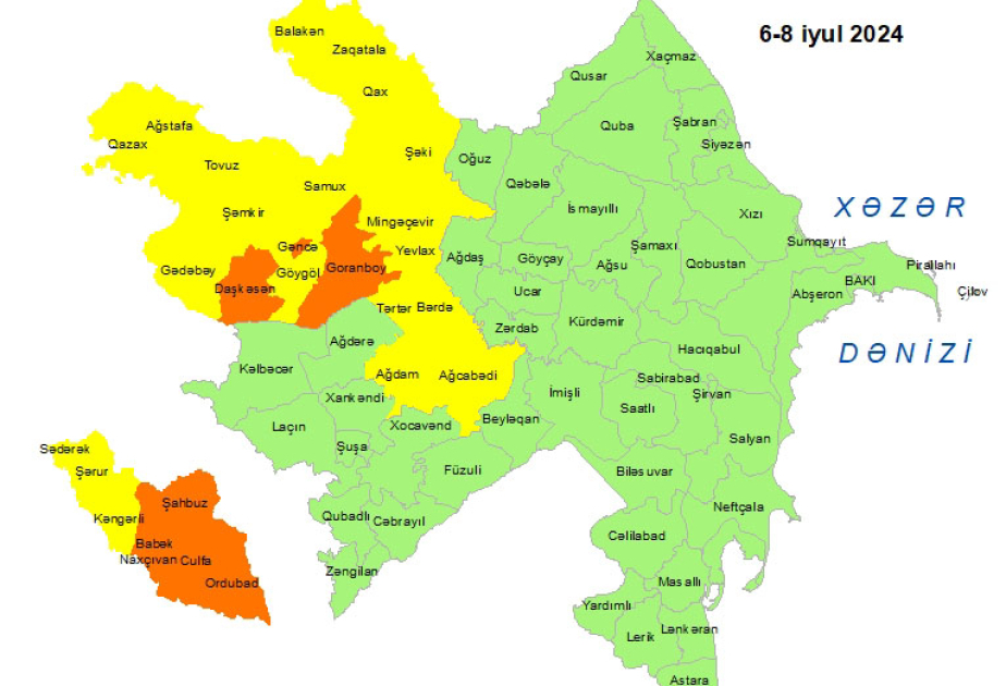 İyulun 6-sı axşamdan 8-i gündüzədək bölgələrdə gözlənilən küləkli hava şəraiti ilə bağlı Milli Hidrometeorologiya Xidməti tərəfindən sarı və narıncı xəbərdarlıqlar verilib.