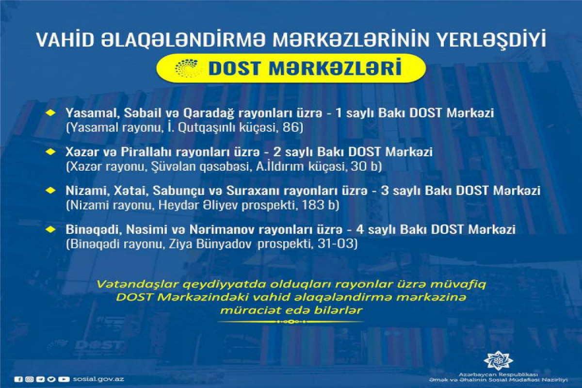 Qeyd edilib ki, mərkəzlərdə 7 dövlət orqanı üzrə 26 istiqamətdə xidmətlər təqdim ediləcək.