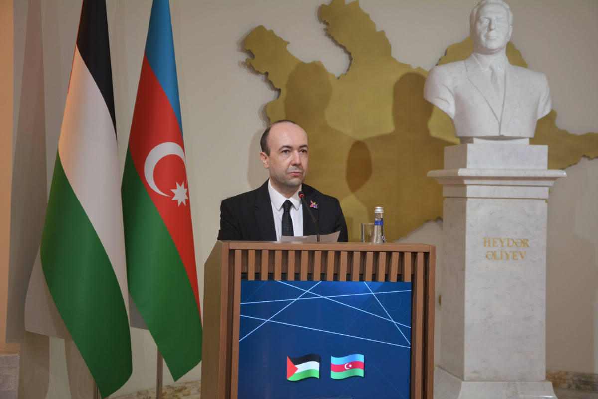 Tədbirdə çıxış edən Azərbaycan Respublikasının xarici işlər nazirinin müavini Fariz Rzayev 15 aprel 1992-ci il tarixində iki ölkə arasında diplomatik münasibətlərin qurulmasının tariximizdə əlamətdar bir hadisə olduğunu qeyd edib. O, Fələstinin Azərbaycanın öz müstəqilliyini bərpa etməsindən sonra onunla diplomatik münasibətlər quran ilk ölkələrdən biri olmasının dostluq və həmrəylik nümunəsi sərgilədiyini bildirib. Azərbaycanın Fələstin ilə münasibətlərə önəm verdiyini qeyd edən Fariz Rzayev, iki ölkə arasında beynəlxalq təşkilatlar çərçivəsində də uğurlu əməkdaşlığın mövcud olduğunu vurğulayıb. Nazir müavini, möhkəm həmrəyliyə əsaslanan Azərbaycan-Fələstin münasibətlərinin bundan sonra da həm ikitərəfli, həm də çoxtərəfli səviyyələrdə uğurla inkişaf edəcəyinə dair inam ifadə edib.