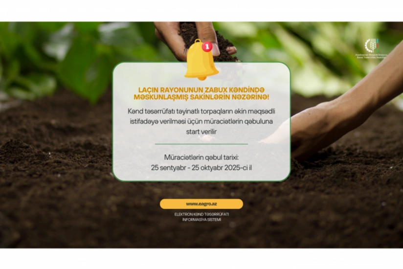 Bu gündən Laçın rayonunun Zabux kəndi üzrə kənd təsərrüfatı təyinatlı torpaqların əkin məqsədli istifadəyə verilməsi üçün Elektron Kənd Təsərrüfatı İnformasiya Sistemi (EKTİS) - eagro.az saytı ilə müraciətlərin qəbuluna başlanılır.