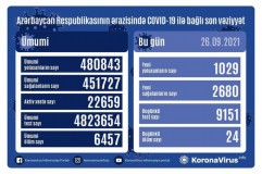 Azərbaycanda son sutkada 2680 nəfər COVID-19-dan sağalıb, 1029 nəfər yoluxub