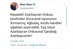 Prezident: “Hadrutda artıq neçə gündür, Azərbaycan bayrağı dalğalanır, Hadrutun ətrafında yüksəkliklərin, təpələrin mütləq əksəriyyəti bizim nəzarətimizdədir”
