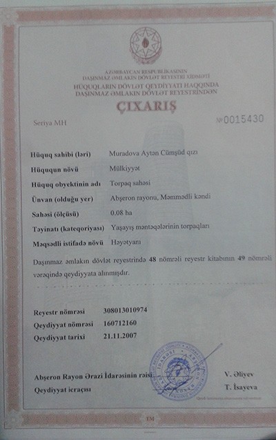 Bu sözləri Aynur Xudiyeva "Qafqazinfo”ya müraciətində deyib. Şikayətçi bildirib ki, 25 may 2006-ci il tarixində Məmmədli Bələdiyyəsindən 0.8 sot həyətyanı torpaq sahəsi alıb. Daha sonra, 2007-ci ildə torpağa çıxarış əldə etsə də, sənədlər hazır olduqdan sonra tikintiyə icazə verilməyib: