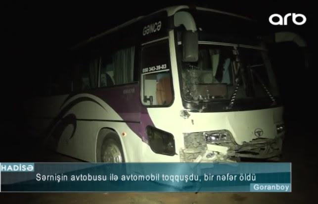 Bakı-Gəncə marşrutu ilə hərəkət edən "Daewoo” markalı sərnişin avtobusu "VAZ 21011” markalı minik avtomobili ilə toqquşub. Qəza nəticəsində minik avtomobilinin sürücüsü, Goranboyun Kələk kənd sakini, 64 yaşlı Nəsrəddin Məmmədov ölüb. Sərnişini, Goranboy rayon Borsunlu kənd sakini 47 yaşlı Habil Həsənov isə xəsarət alıb.