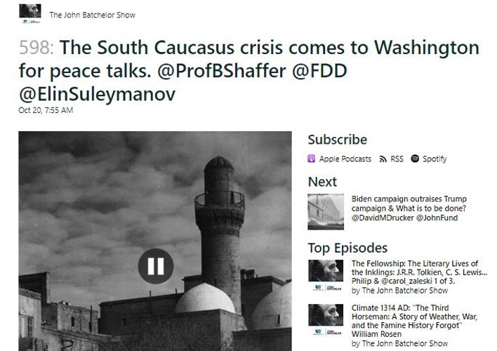 ABŞ-ın nüfuzlu və milyonlarla dinləyici kütləsinə malik “Con Batchelor Şou” radio proqramında Ermənistanın ölkəmizə qarşı son hərbi təxribatı nəticəsində yaranmış gərginlik, humanitar sülh razılaşmaları və münaqişənin nizamlanması istiqamətində Azərbaycan və Ermənistan xarici işlər nazirlərinin Vaşinqtona səfərləri, ABŞ dövlət katibi Mayk Pompeo ilə nəzərdə tutulan görüşləri ilə bağlı veriliş yayımlanıb.