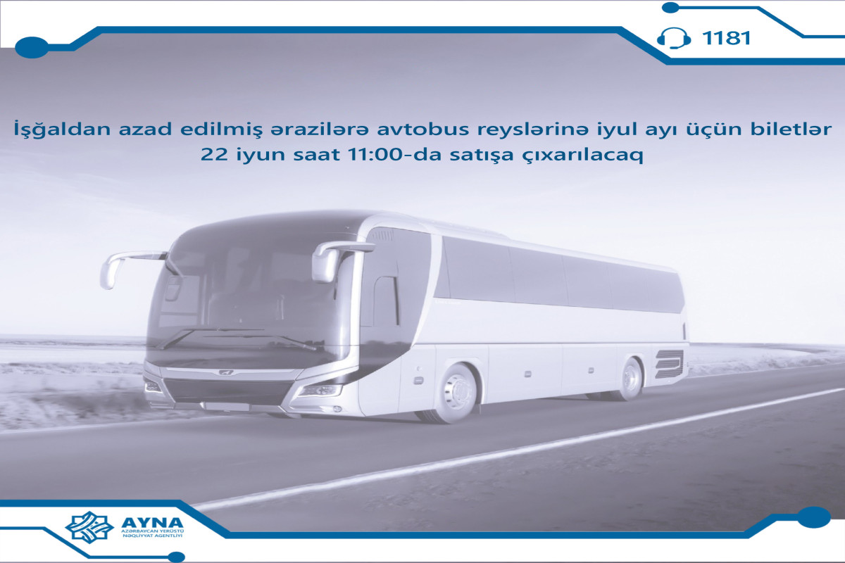 Rəqəmsal İnkişaf və Nəqliyyat Nazirliyinin tabeliyində olan Azərbaycan Yerüstü Nəqliyyat Agentliyinin (AYNA) işğaldan azad olunmuş ərazilərə təşkil etdiyi müntəzəm avtobus reyslərinə iyul ayı üçün biletlər 22 iyun, saat 11:00-da satışa çıxarılacaq.