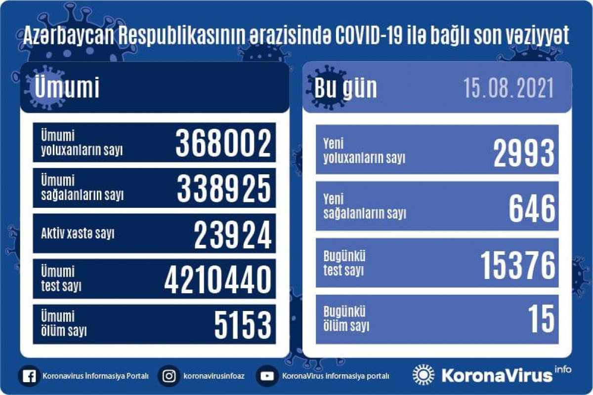 Azərbaycan Respublikasında koronavirus (COVID-19) infeksiyasına 2 993 yeni yoluxma faktı qeydə alınıb, 646 nəfər müalicə olunaraq sağalıb.
