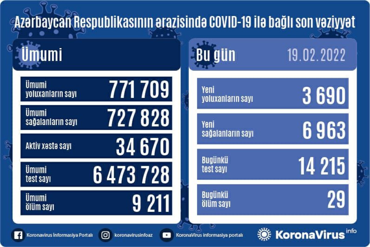 Azərbaycan Respublikasında koronavirus (COVID-19) infeksiyasına 3 690 yeni yoluxma faktı qeydə alınıb, 6 963 nəfər müalicə olunaraq sağalıb.
