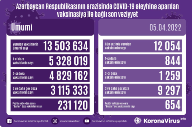 Son sutkada birinci mərhələ üzrə vaksinasiya olunanların sayı 844, ikinci mərhələ üzrə vaksinasiya olunanların sayı 1259, üç və daha çox doza üzrə vaksinasiya olunanların sayı 9 297, pozitiv nəticədən sonra buster doza üzrə vaksinasiya olunanların sayı 654-dür.