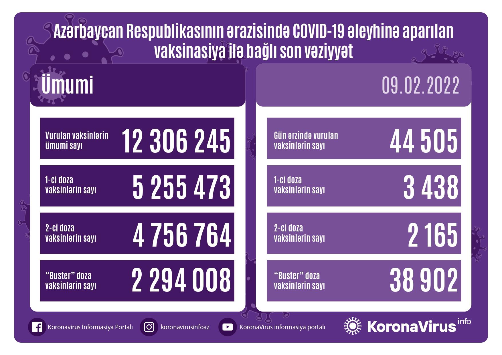 Azərbaycanda bu günə qədər vurulan vaksinlərin ümumi sayı 12 306 245, birinci mərhələ üzrə peyvənd olunanların ümumi sayı 5 255 473, ikinci mərhələ üzrə vaksinasiya edilənlərin sayı 4 756 764 nəfər təşkil edir.