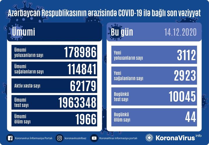Nazirlər Kabineti yanında Operativ Qərargahdan verilən məlumata görə, onlardan 114841 nəfər müalicə olunaraq sağalıb, 1966 nəfər vəfat edib, aktiv xəstə sayı 62179 nəfərdir.