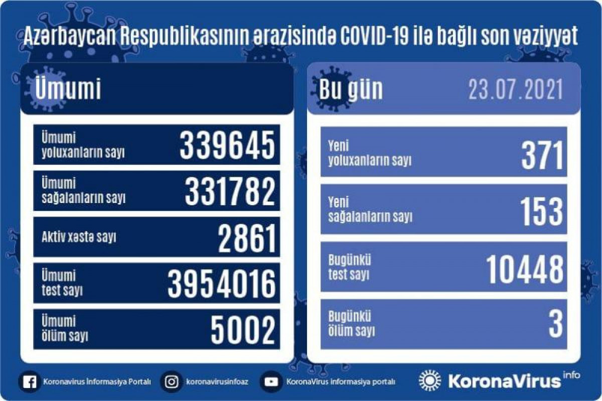 Azərbaycan Respublikasında koronavirus (COVID-19) infeksiyasına 371 yeni yoluxma faktı qeydə alınıb, 153 nəfər müalicə olunaraq sağalıb.