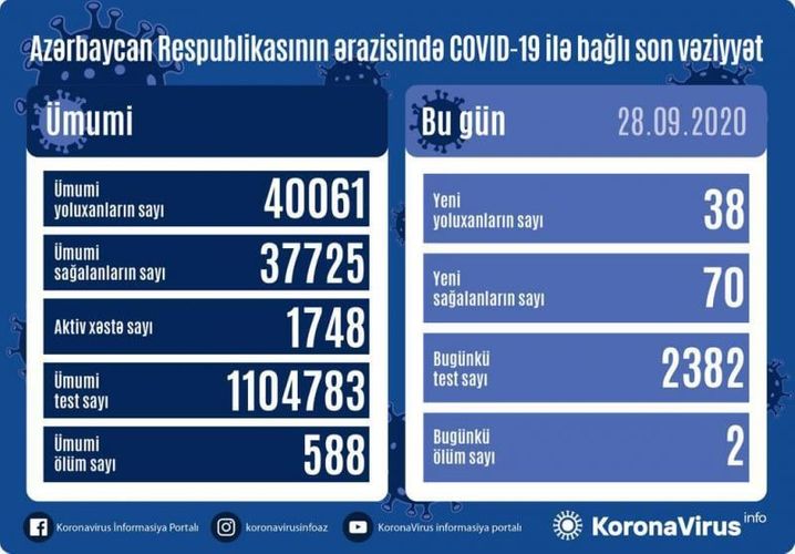 Azərbaycanda indiyədək ümumilikdə 40061 nəfər koronavirus infeksiyasına yoluxub. Onlardan 37725 nəfər müalicə olunaraq sağalıb, 588 nəfər vəfat edib, aktiv xəstə sayı 1748 nəfərdir.