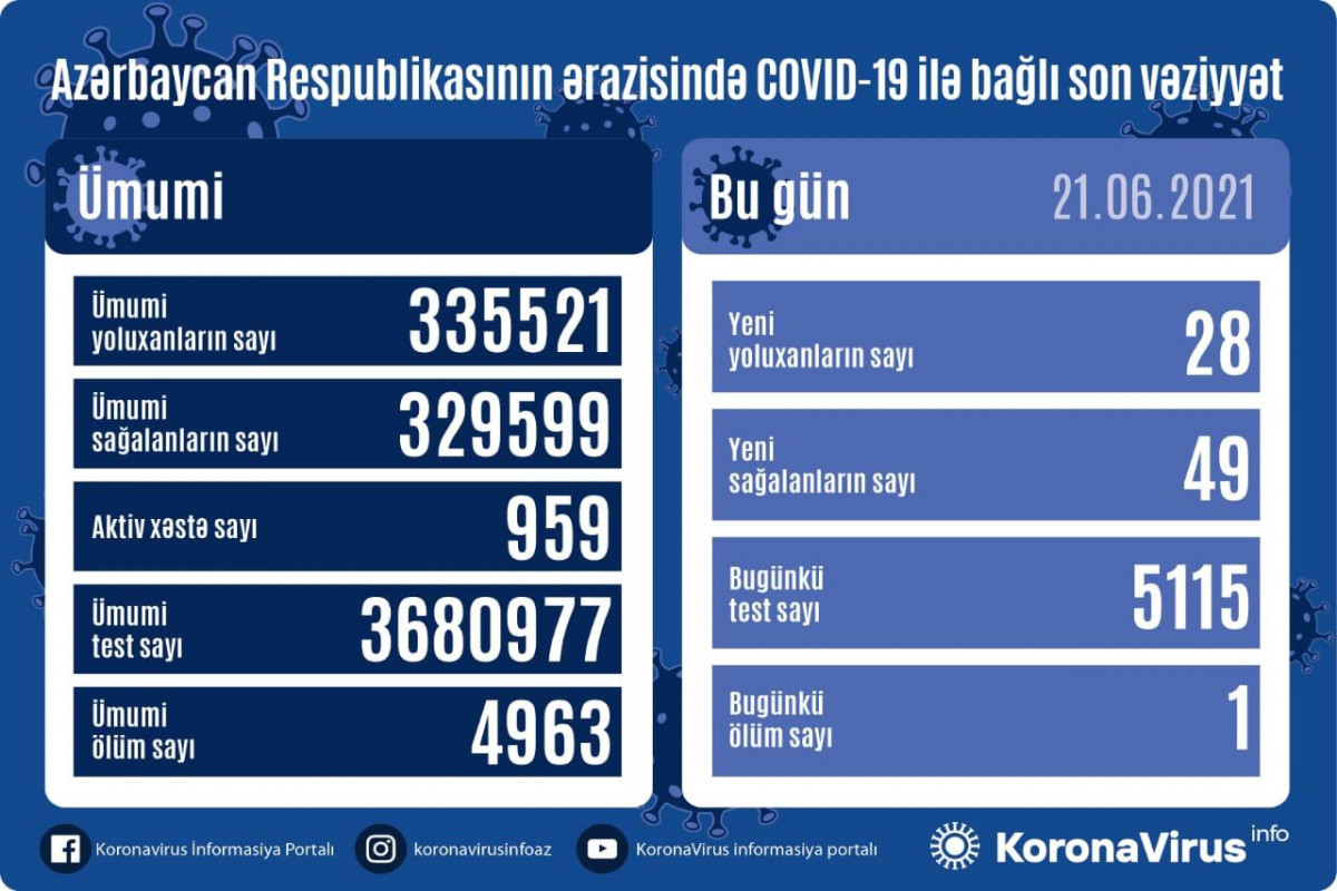 Azərbaycan Respublikasında koronavirus (COVID-19) infeksiyasına 28 yeni yoluxma faktı qeydə alınıb, 49 nəfər müalicə olunaraq sağalıb.
