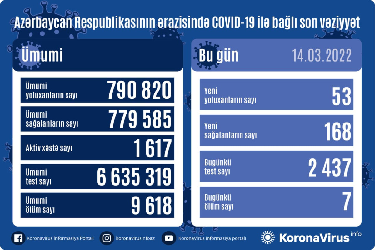 Azərbaycan Respublikasında koronavirus (COVID-19) infeksiyasına 53 yeni yoluxma faktı qeydə alınıb,168 nəfər müalicə olunaraq sağalıb.