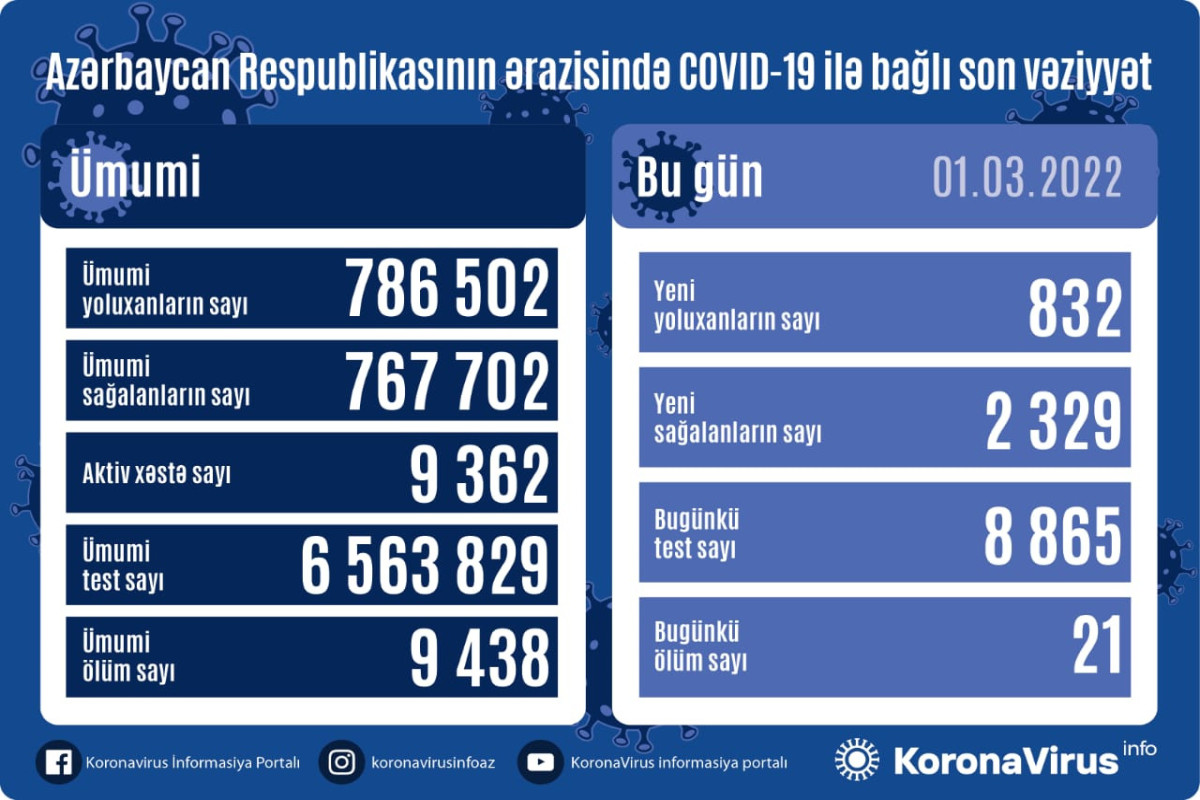 Azərbaycanda indiyədək ümumilikdə 768 502 nəfər koronavirus infeksiyasına yoluxub. Onlardan 767 702 nəfər müalicə olunaraq sağalıb, 9 438 nəfər vəfat edib, aktiv xəstə sayı 9 362 nəfərdir.