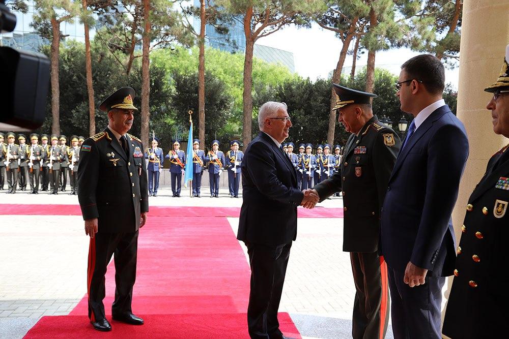 Sonra Müdafiə Nazirliyində təntənəli qarşılama mərasimi olub, hər iki ölkənin müdafiə nazirləri fəxri qarovulun önündən keçib. Müdafiə Nazirliyinin Nümunəvi Hərbi Orkestrinin ifasında Azərbaycan və Türkiyənin Dövlət himnləri səsləndirilib. Protokola uyğun olaraq “Şərəf kitabı” imzalanıb.