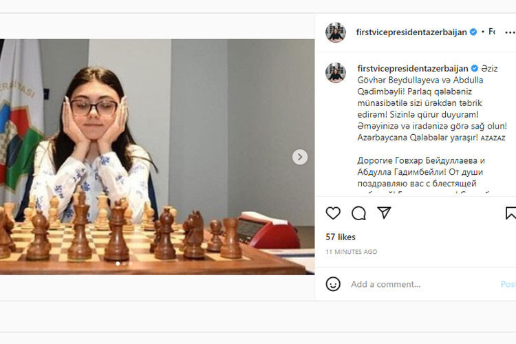 Birinci vitse-prezident Mehriban Əliyeva 20 yaşa qədər şahmatçılar arasında dünya çempionu olan Gövhər Beydullayeva və Abdulla Qədimbəylini təbrik edib.
