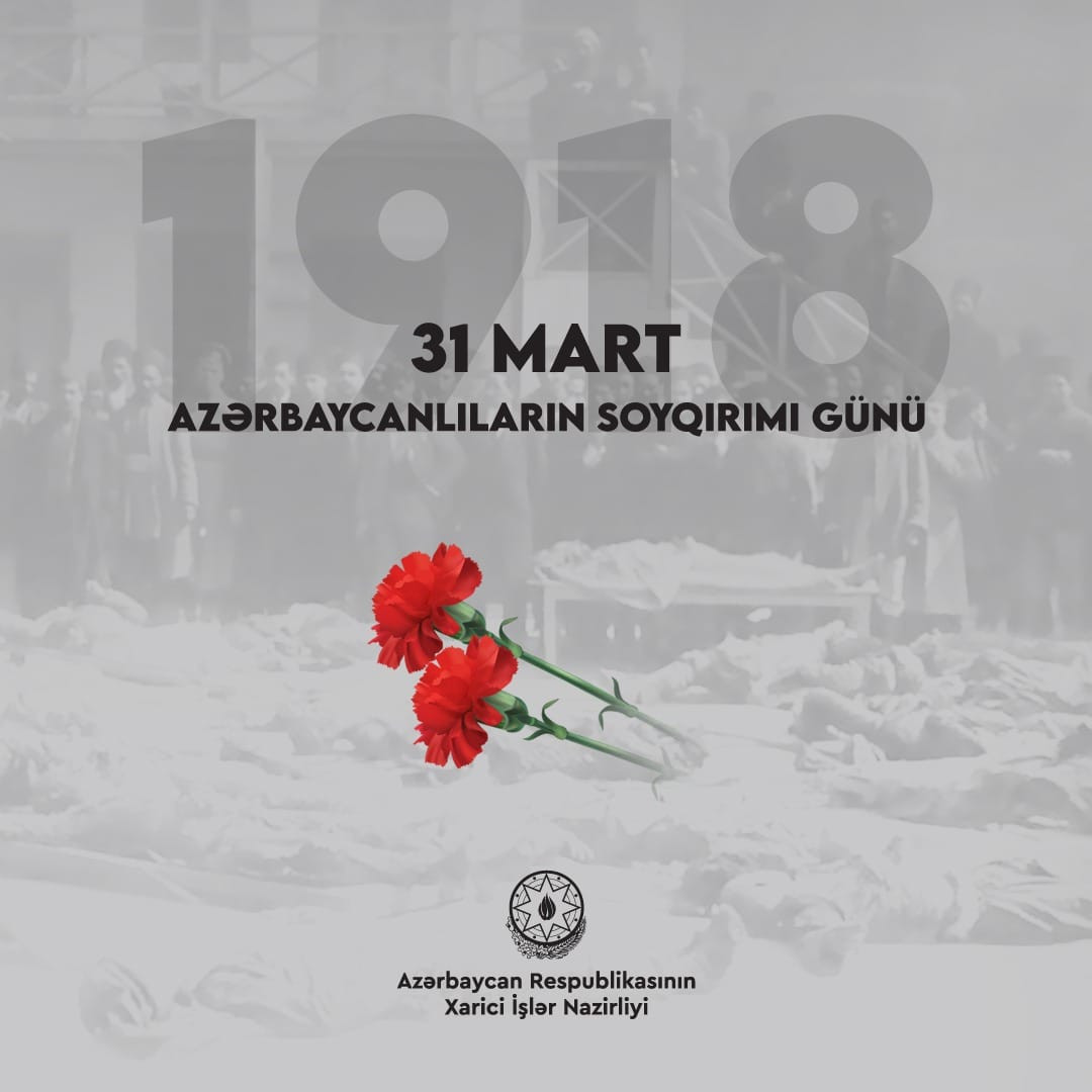 “31 Mart “Azərbaycanlıların Soyqırımı Günü”ndə soyqırımı qurbanlarını yad edir və belə qeyri-insani cinayətlərin təkrarlanmaması üçün Ermənistanın cəzasız qalmasının dayandırılmasının vacibliyini bir daha bildiririk” – nazir qeyd edib.