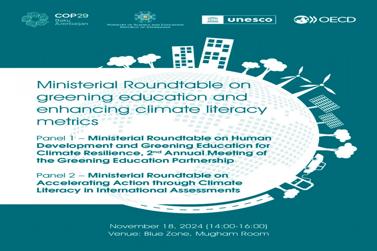 Bildirilib ki, noyabrın 18-də COP29 Sədrliyi, Elm və Təhsil Nazirliyi, UNESCO, İqtisadi Əməkdaşlıq və İnkişaf Təşkilatının (İƏİT) tərəfdaşlığı ilə müxtəlif ölkələrin təhsil nazirlərinin iştirakı ilə “Təhsilin yaşıllaşdırılması və iqlim dayanıqlılığı”, “Beynəlxalq qiymətləndirmə çərçivəsində ətraf mühit savadlılığının ölçülməsi” mövzularında panellər təşkil ediləcək. COP29 çərçivəsində həmçinin BMT-nin 2022-ci ildə başlatdığı və 90-dan çox ölkənin qoşulduğu "Greening Education Partnership" təşəbbüsünün ikinci dəfə illik iclasının keçirilməsi nəzərdə tutulur.