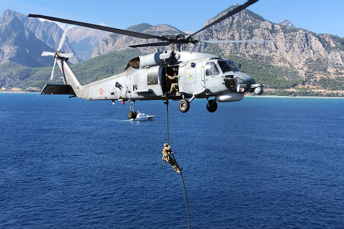 Helikopterlərdən gəmiyə enən hərbi qulluqçuların Azərbaycan və Türkiyə bayraqlarını dalğalandırması böyük maraqla qarşılanıb.