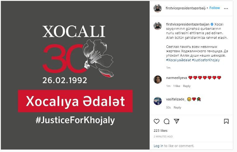 Azərbaycanın Birinci vitse-prezidenti Mehriban Əliyeva Xocalı soyqırımı ilə bağlı paylaşım edib.