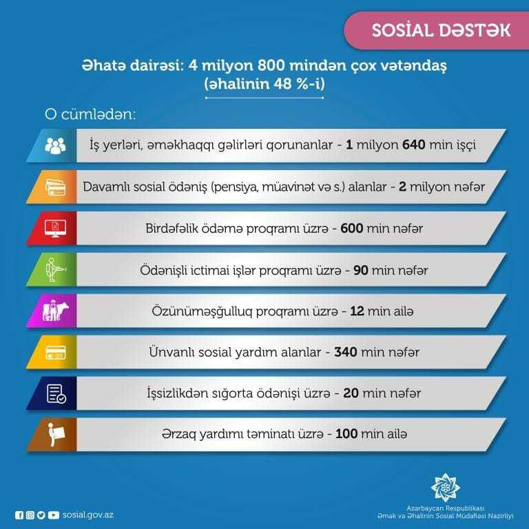 82 min ailənin 340 minədək üzvü ünvanlı dövlət sosial yardımı ilə, 20 minədək şəxsin işsizlikdən sığorta ödənişi, 100 minədək aztəminatlı ailənin ərzaq yardımı ilə təminatı işləri aparılır.