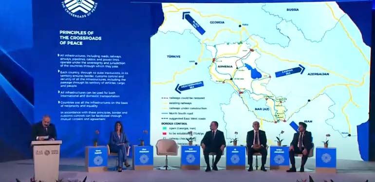 Xəritədə həmçinin, Zəngəzur dəhlizi ilə Azərbaycanla dəmir yolu və avtomobil yollarının bərpasının mümkünlüyü və bunun isə Xəzər dənizi ilə Aralıq dənizi arasındakı nəqliyyat əlaqələrini daha da qısaldacağı qeyd edilib.