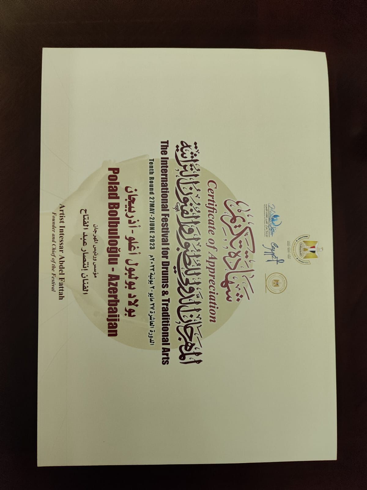 Cari ilin 27 may-02 iyun tarixlərində MƏR Mədəniyyət Nazirliyinin təşkilatçılığı ilə Misir paytaxtı Qəhrə şəhərində "Zərb alətləri və ənənəvi incəsənət üzrə Beynəlxalq Festival" keçirilmişdir.