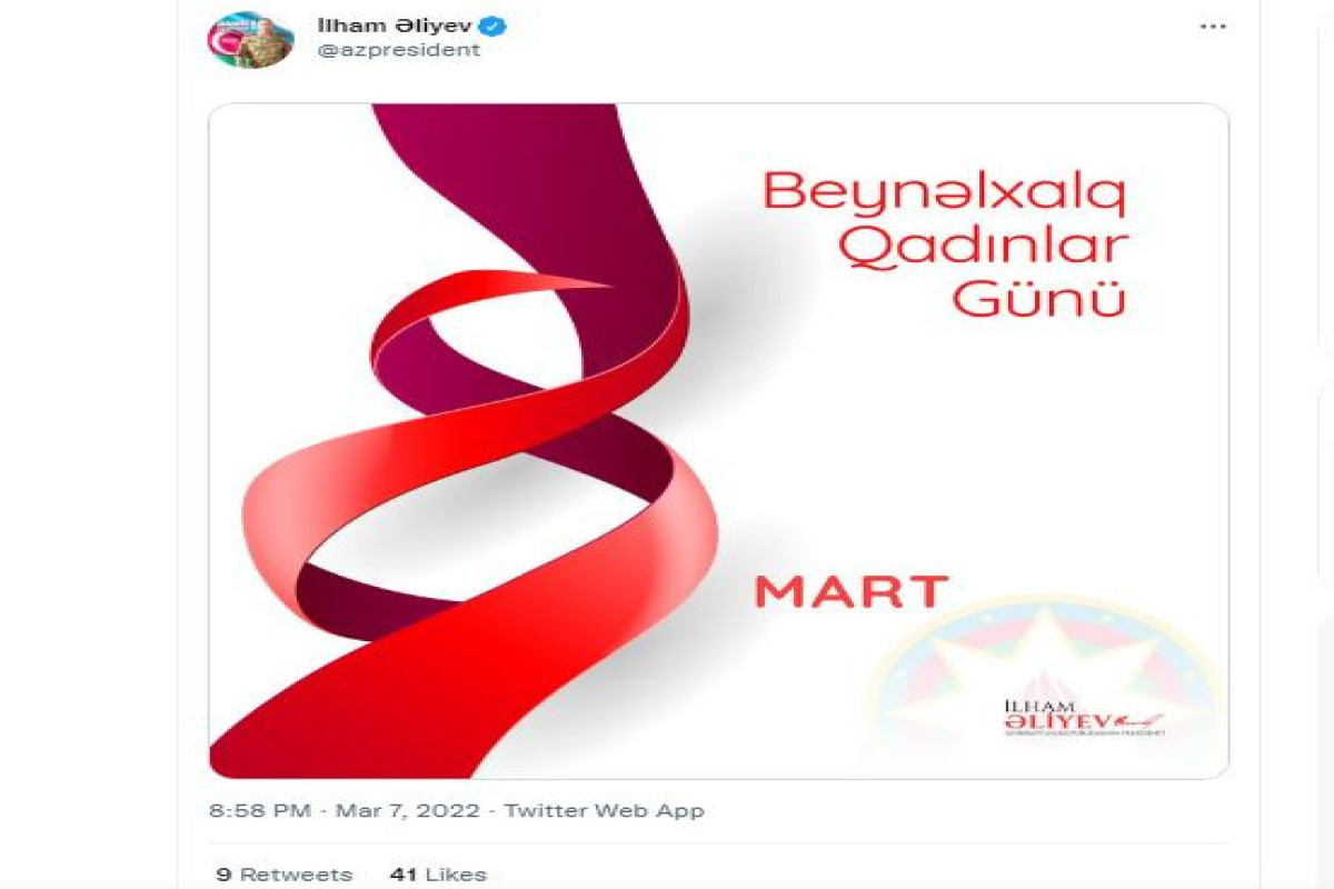 Azərbaycan Respublikasının Prezidenti İlham Əliyev Tvitter hesabında 8 Mart beynəlxalq qadınlar gün ilə bağlı paylaşım edib.