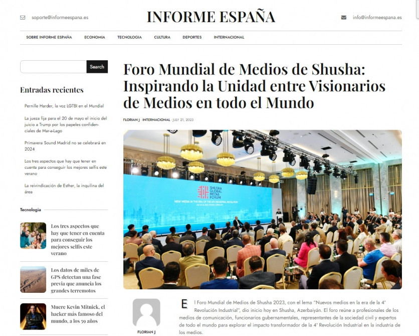 İspaniyanın “El Periodista” nəşrində dərc olunan xəbərdə də Azərbaycan Prezidenti İlham Əliyevin Forumdakı çıxışının əsas məqamları yer alıb. Materialda dövlətimizin başçısının dünyada və Cənubi Qafqaz regionunda yaranmış yeni reallıqlar, Qarabağda son vəziyyət və bu regionda yaşayan erməni azlığı ilə bağlı fikirləri, işğaldan azad olunmuş ərazilərin minalardan təmizlənməsi və azərbaycanlıların öz torpaqlarına qayıtması barədə fikirləri yer alıb.
