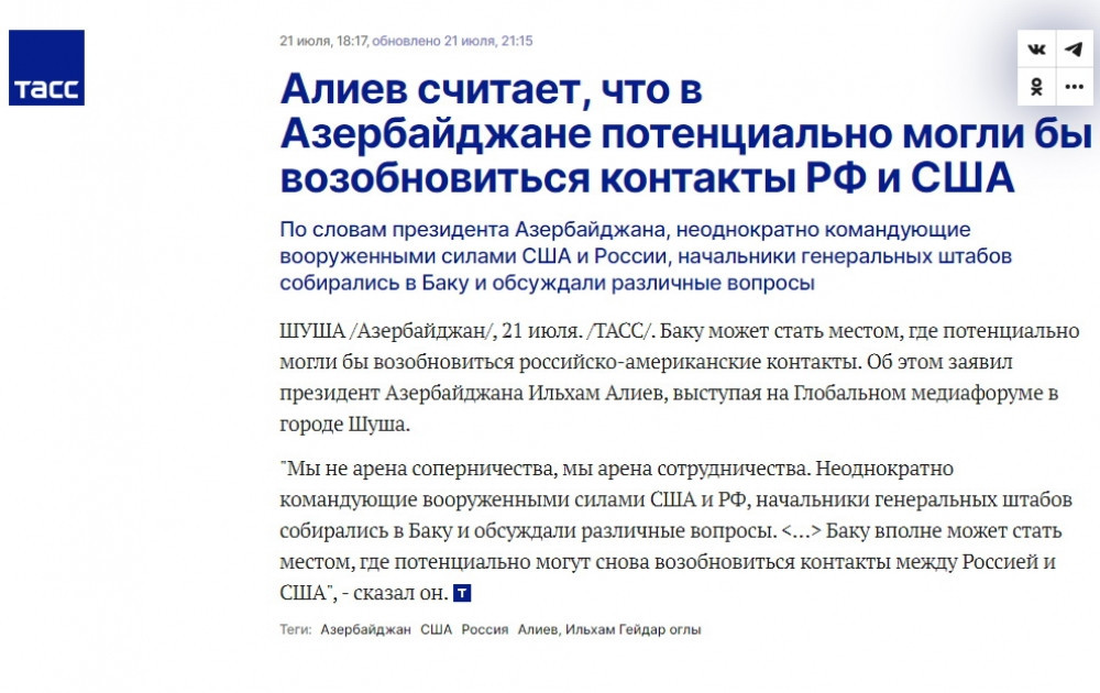 Şuşa Qlobal Media Forumu ilə xəbərlər Rusiya mediasının da diqqət mərkəzindədir. Bu ölkənin rəsmi TASS agentliyi, habelə “Vestnik Kavkaza” xəbər portalı Prezident İlham Əliyevin Rusiya-Azərbaycan münasibətləri, Azərbaycanın Moskva ilə Vaşinqton arasında münasibətlərin bərpası üzrə danışıqlar məkanı ola biləcəyi barədə fikirləri yer alıb. Qeyd olunub ki, dövlət başçısı Moskva ilə münasibətlərin strateji tərəfdaşlıq səviyyəsində olduğunu, həmçinin konkret nəticələrə əsaslandığını bildirib.