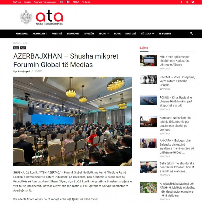 Albaniya Teleqraf Agentliyinin (ATA) yaydığı xəbərdə qeyd olunub ki, Azərbaycan Prezidenti İlham Əliyev Şuşa Qlobal Media Forumunda mühüm qlobal və regional məsələlərə toxunub. Xəbərdə diqqətə çatdırılıb ki, Prezident İlham Əliyev Türkiyənin İkinci Qarabağ müharibəsində Azərbaycanın yanında olması, rəsmi Bakının Moskva ilə münasibətləri, Azərbaycanın Qoşulmama Hərəkatına uğurlu sədrliyi, müharibədə qazanılmış Qələbədən sonra regionda yaranmış yeni reallıqlar, Ermənistanın mina terroru və sülh prosesi kimi məsələlərdən bəhs edib.