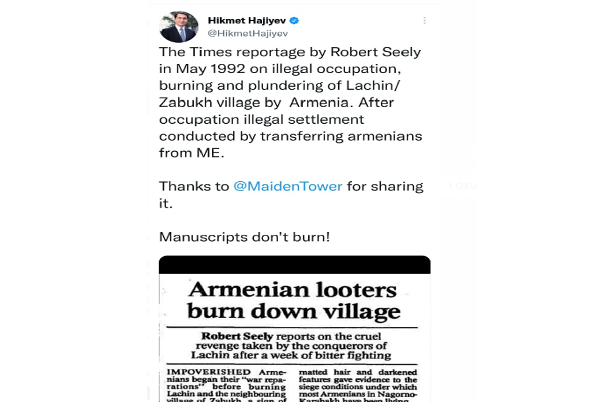 “Ermənistan tərəfindən 1992-ci ildə Laçının Zabux kəndinin qanunsuz işğalı, yandırılması və yağmalanması ilə bağlı Robert Siilinin "The Times" reportajı. İşğaldan sonra Yaxın Şərqdən olan ermənilərin qanunsuz məskunlaşdırılması aparıldı. Əlyazmalar yanmır”, - Prezidentin köməkçisi vurğulayıb.