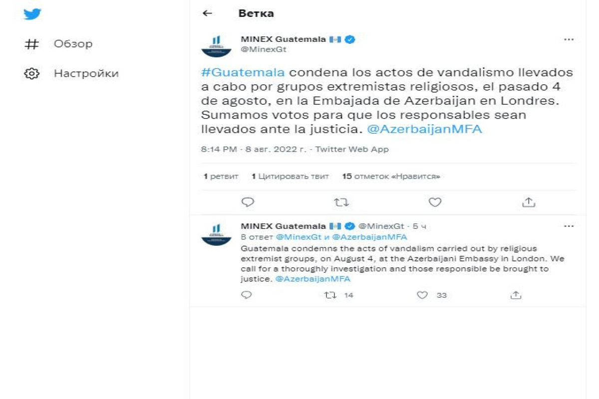 Bildirilib ki, Qvatemala avqustun 4-də Azərbaycanın Londondakı səfirliyində dini ekstremist qruplar tərəfindən həyata keçirilən vandalizm aktlarını pisləyir. Nazirlik təqsirkarların məsuliyyətə cəlb olunmasını istəyir.