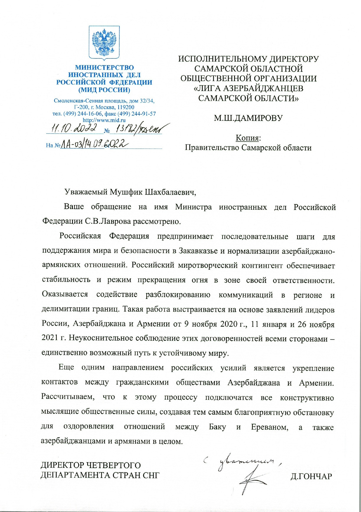 Diasporla İş üzrə Dövlət Komitəsindən verilən xəbərə görə, Rusiya XİN-in MDB ölkələri üzrə dördüncü departamentinin direktoru Denis Qonçarın adından “Samara vilayəti Azərbaycanlılarının Liqası” ictimai təşkilatının icraçı direktoru Müşfiq Dəmirova və “İvanovo Azərbaycanlılarının Milli-Mədəni Muxtariyyəti” regional ictimai təşkilatının sədri Asif Məmmədova ünvanlanan cavab məktublarında bildirilib ki, soydaşlarımızın Rusiya Prezidenti Vladimir Putinin və xarici işlər naziri Sergey Lavrovun adına göndərdikləri müraciətlərə baxılıb.