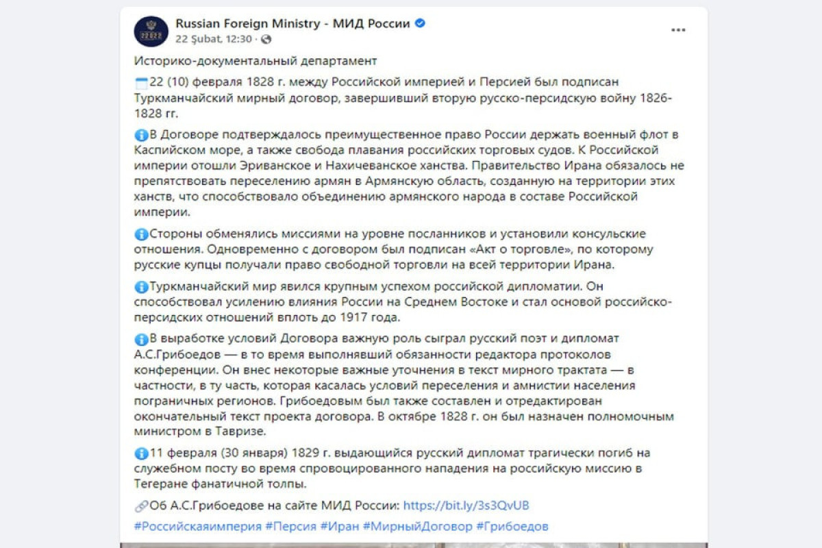 Qeyd edək ki, fevralın 22-də Rusiya XİN-in rəsmi sosial şəbəkə hesabında 1828-ci il Türkmənçay Müqaviləsi ilə bağlı təhrif olunmuş məlumat paylaşılıb. Sözügedən müqavilədə “Şərqi Ermənistan” sözünə istinad edilib.