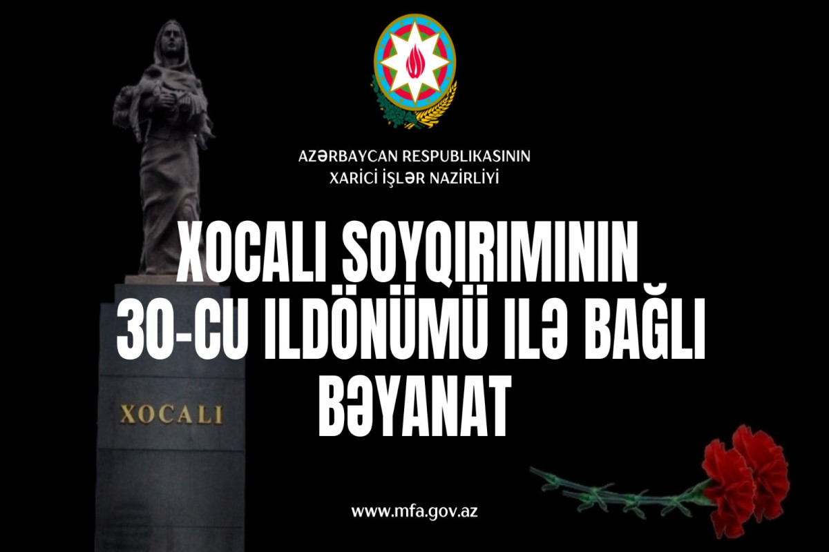 Azərbaycan Respublikasının Xarici İşlər Nazirliyi Xocalı soyqırımının 30-cu ildönümü ilə bağlı bəyanat yayıb.